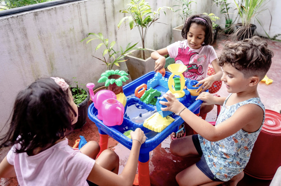 The water tray is great because most kids enjoy the tipping, the pouring, the splashing and will do individual separate play.Jugs, sieves and funnels are enough toys to start with.