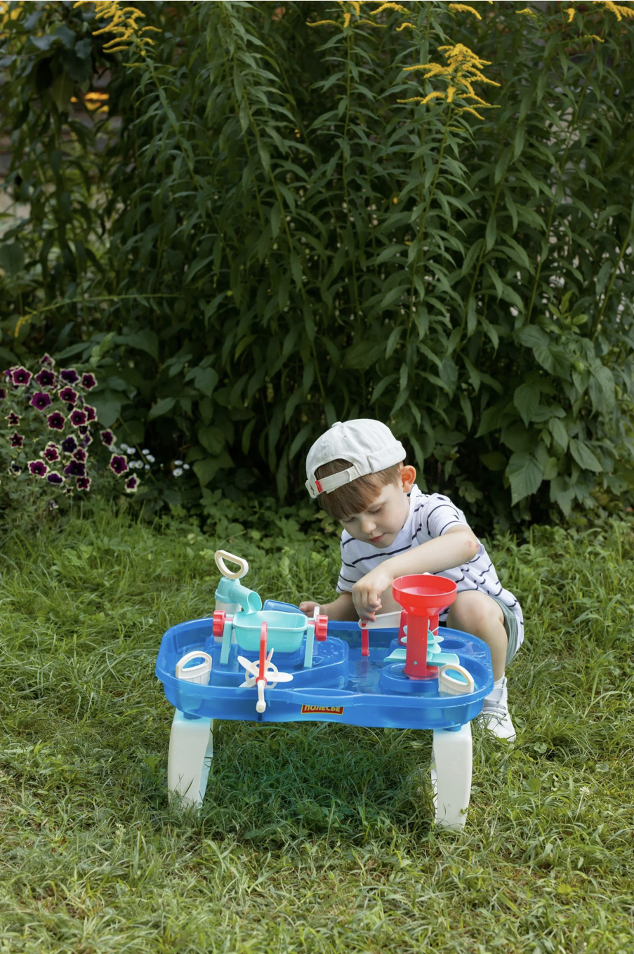 The water tray activity is one way to meet them at their stage of development and move them from individual play (on their own, seeming uninterested in others), to parallel play and eventually collaborative play.